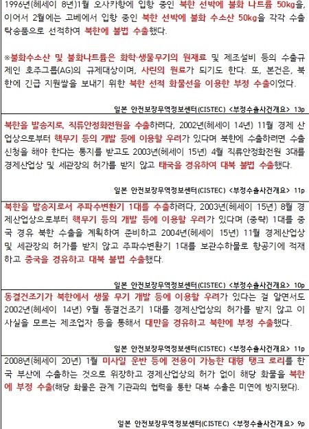 국회 국방위원회 소속 하태경 의원이 CISTEC으로부터 입수한 ‘부정수출사건개요’ 자료를 살펴보면 일본에서는 약 20년간 30건 넘는 대북밀수출사건이 발생된 것으로 확인됐다. 이 중에는 일본이 핵개발·생화학무기에 활용될 수 있는 전략물자가 포함돼 있었다.