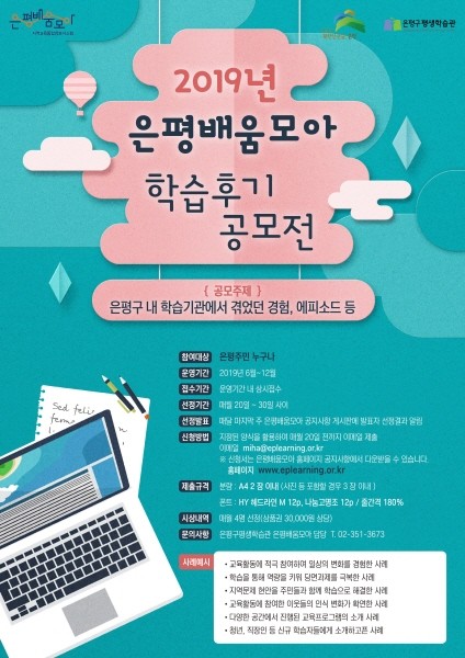 ‘2019년 시민참여 학습후기 공모전’은 ‘은평배움모아’홈페이지 ‘소통모아-이벤트’ 항목에서 지정된 양식을 활용해 매월 20일 전까지 전자우편으로 학습후기를 제출할 수 있다.