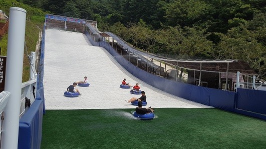 좌구산 썰매장은 길이 총연장 82m, 폭 12m로 6명이 동시에 출발할 수 있다.