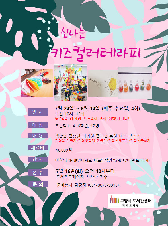 고양시 덕이도서관은 오는 24일부터 8월14일까지 매주 수요일에 여름방학특강으로 초등 고학년 대상 ‘신나는 컬러키즈테라피’ 강좌를 운영한다.