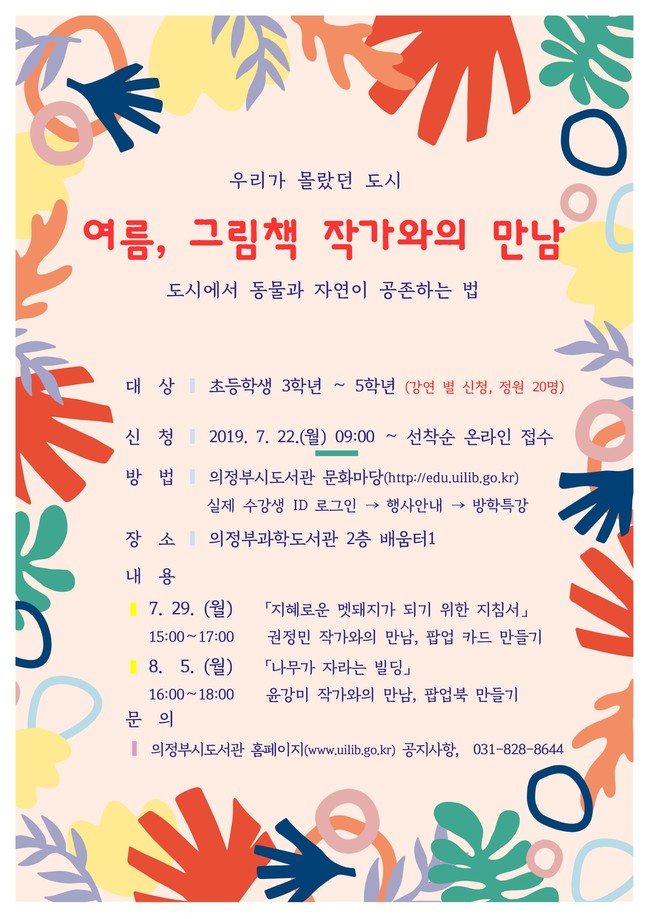 여름, 그림책 작가와의 만남은 7월 22일부터 의정부시 도서관 문화마당 홈페이지에서 사전 신청할 수 있으며, 자세한 문의사항은 의정부시 도서관정책팀으로 연락하면 된다.