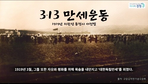 경기도교육청은 11일 경기남부보훈지청 대강당에서 교직원, 학생, 학부모 100여 명이 참석한 가운데 경기학생 평화역사탐방 프로젝트 영상 ‘100년을 거슬러 간도에서 다시 읽는 독립선언서’시사회를 연다.