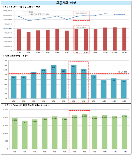 도로교통공단에 따르면, 최근 5년간 7~8월 기간 교통사고는 총 971,323건이 발생하였으며, 이로 인해 3,606명의 사망자와 1,567,156명의 부상자가 발생했다.