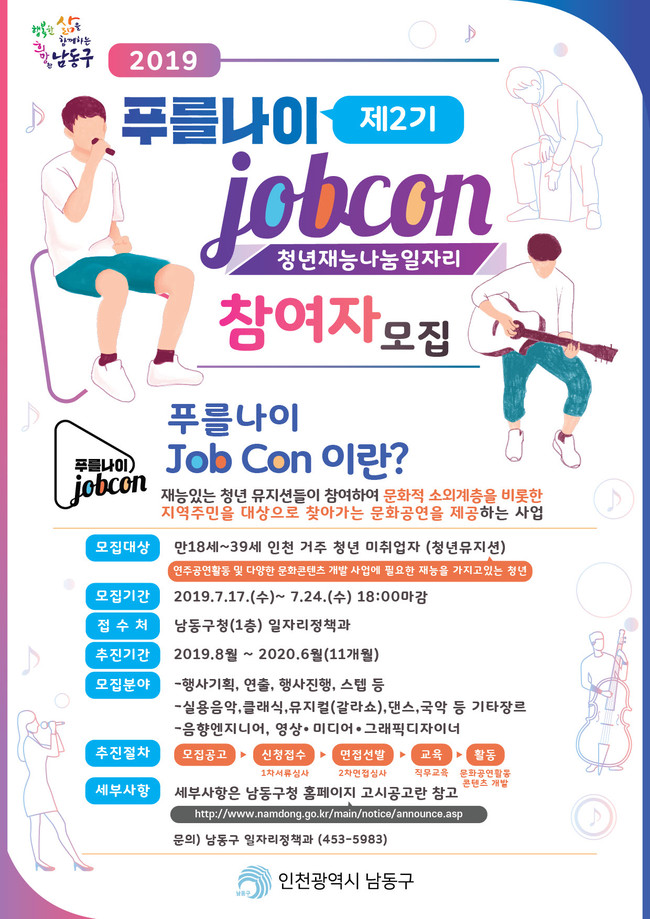 인천 남동구가 청년재능 나눔 일자리사업으로 추진 중인‘푸를나이 JOB CON’사업 참여 청년 뮤지션을 오는 24일까지 모집한다.