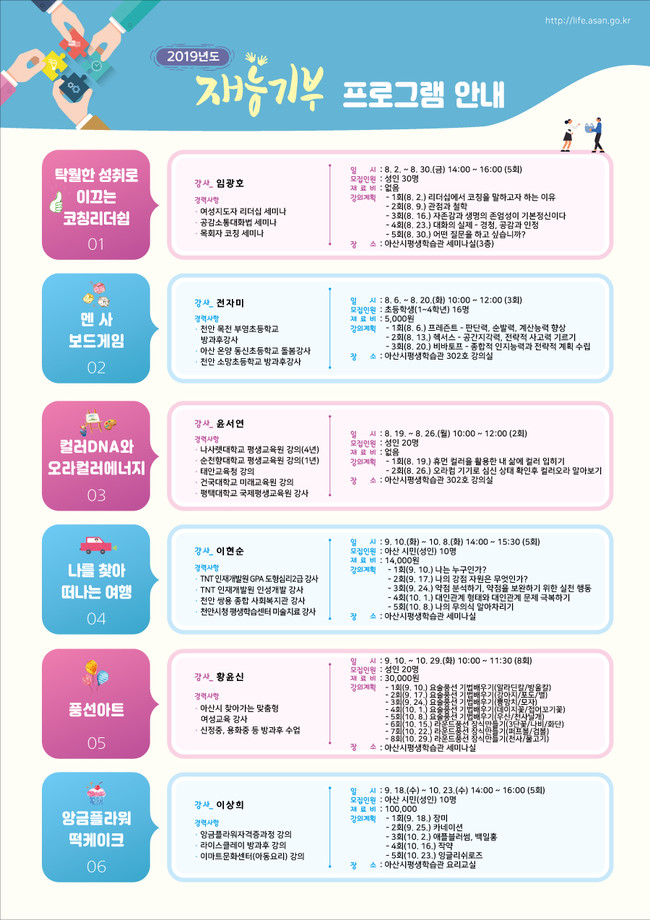 이번 재능기부 프로그램은 코칭리더십, 맨사보드게임, 오라컬러에너지, 성격과 심리파악 프로그램, 앙금플라워 떡테이크, 풍선아트 등 6개 강좌가 운영된다.