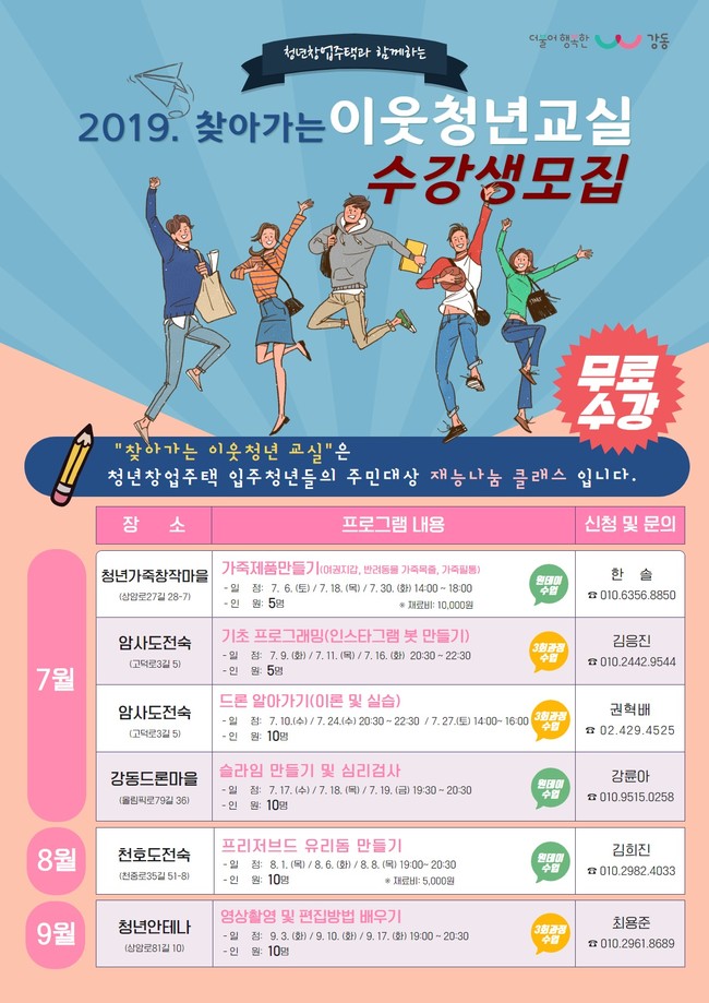 강동구가 이달부터 청년창업주택 입주청년들이 지역 주민들과 교류하며 재능을 나누는 ‘찾아가는 이웃청년 교실’을 운영한다.