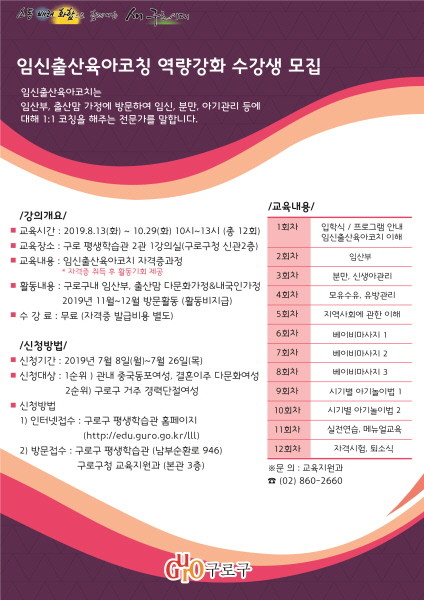 교육은 자격증 취득 과정으로 내달 13일부터 10월 29일까지 총 12회에 걸쳐 구청 평생학습관에서 진행된다. 출산준비, 신생아 돌보기, 보건소 정책, 관내 육아기관·문화시설 정보, 베이비 마사지 등으로 구성된다.