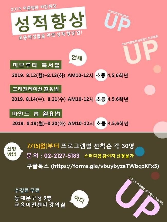 구는 초등학생들이 방학기간 동안 학습역량을 끌어올릴 수 있도록 초등학교 4~6학년을 대상으로 동대문구청 9층 교육비전센터 강의실에서 8월 12일부터 21일까지 비전캠프 ‘성적향상 업’을 운영한다.