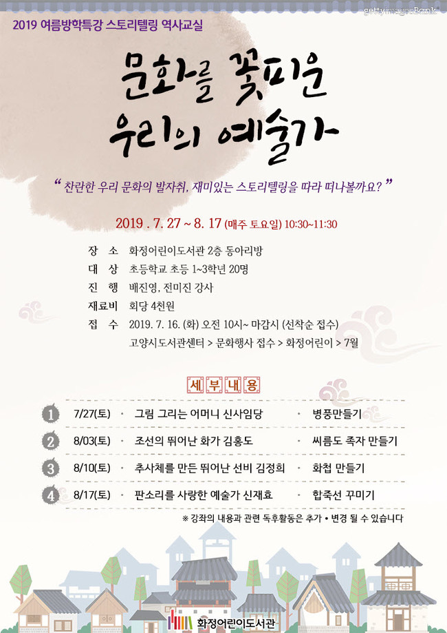 고양시 화정어린이도서관은 다가오는 여름방학 동안 초등학교 1~3학년을 대상으로 ‘문화를 꽃피운 우리의 예술가’ 강좌를 운영한다.