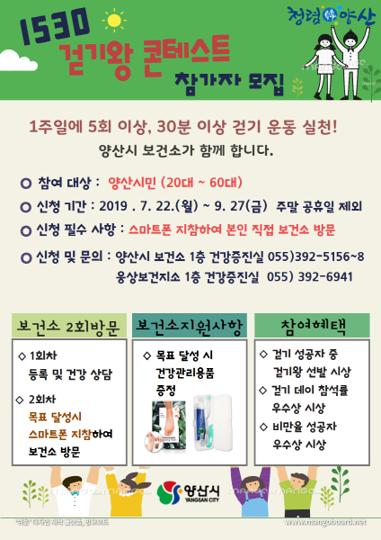 [39-20190712140059.png][제호] 양산시보건소는 시민의 걷기실천율을 제고하고 건강증진을 도모하기 위한 ‘하반기 1530 걷기왕 콘테스트 사업’ 대상자를 모집한다고 밝혔다.