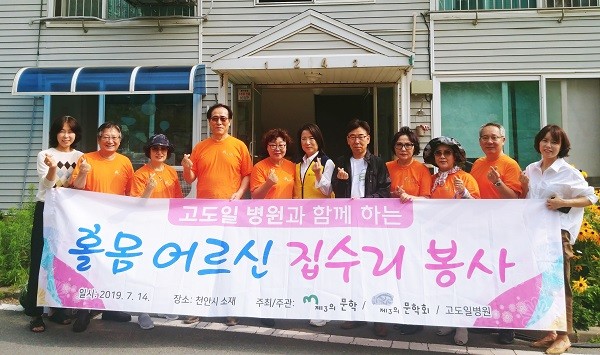 고도일병원 관계자와 제3의문학회 회원들 약 15명은 지난 14일 폭염에도 불구하고 구슬땀을 흘리며 목천읍 저소득가정에서 정리정돈과 대청소를 실시했으며, 도배·싱크대 교체를 통해 어둡고 열악했던 주거환경을 청결하고 환하게 변화시켰다.