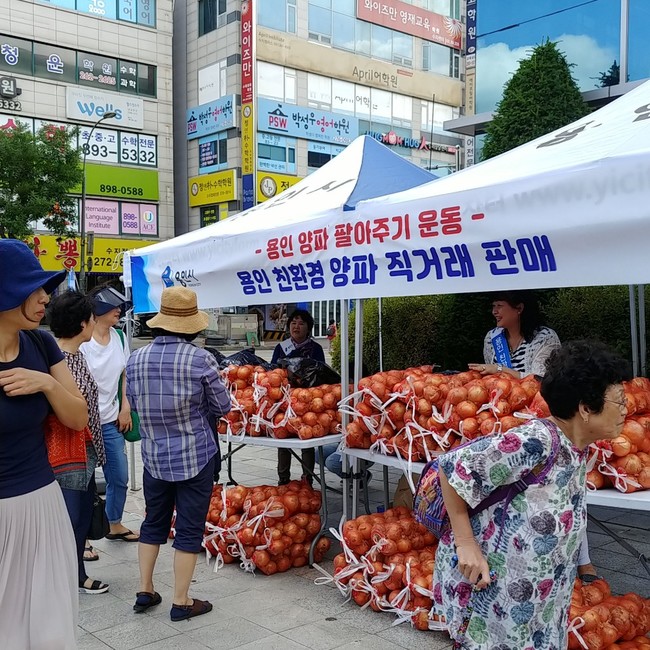 한국여성농업인용인시연합회의 도움으로 열린 이날 장터에선 관내에서 생산된 친환경 양파 5kg짜리 200자루가 판매됐다.