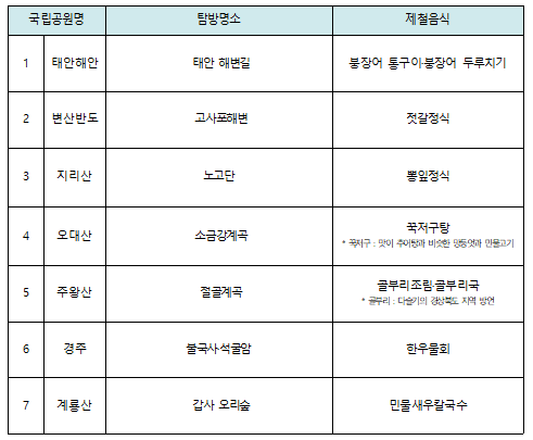 문명근 국립공원공단 탐방복지처장은 “지역의 특색이 담겨 있는 향토음식과 함께 국립공원 탐방의 즐거움을 만끽하길 바란다”라고 말했다.