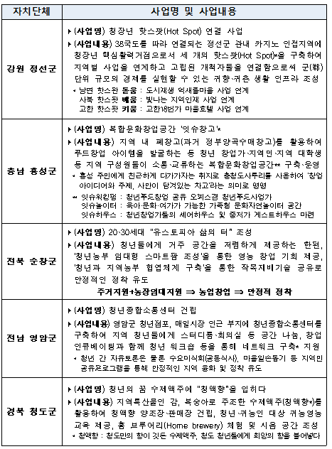 행안부는 지난 4월부터 지방자치단체를 대상으로 공모를 실시해, 강원 정선군, 충남 홍성군, 전북 순창군, 전남 영암군, 경북 청도군이 최종 사업지로 선정됐다.