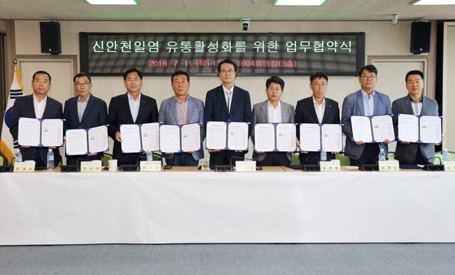 1004섬 신안군은 지난 11일 목포신안군농협조합공동사업법인 한기영 대표, 압해농협 천성태 조합장, 임자농협 변재남 조합장, 북신안농협 양영모 조합장, 남신안농협 김병남 조합장, 비금·도초·신안농협 관계자 등 30여명이 참석한 가운데 신안천일염 유통활성화 방안에 대한 업무협약을 체결했다.