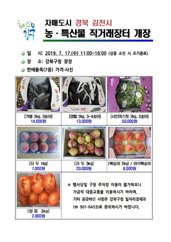 강북구는 오는 17일 강북구청 광장에서 자매결연지인 경북 김천시의 포도, 자두, 복숭아 등 농·특산물 직거래장터를 개최한다.
