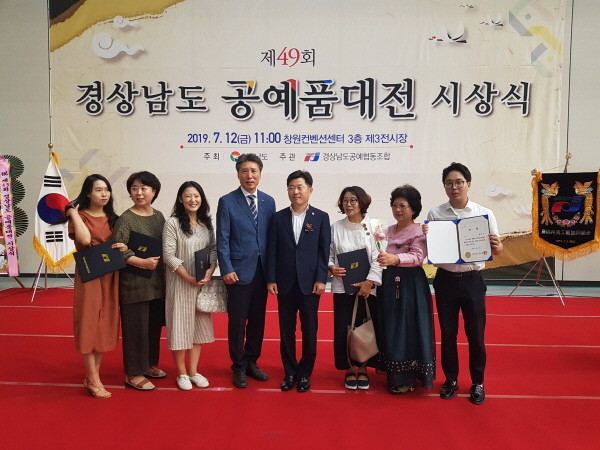 공예대전 수상 모습(왼쪽부터 천수현, 손제숙, 서숙현, 허일 경상남도공예협동조합 이사장, 김진옥 도의원, 최미수, 김중기, 이형석 주무관)