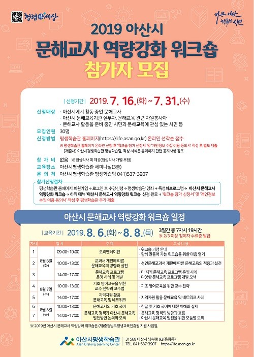 참가자 모집은 7월 16일부터 7월 31일까지이며, 아산시에서 활동 중인 문해교사, 아산시 문해교육기관 실무자, 문해교육 관련 자원봉사자, 문해교사 활동을 준비 중이거나 문해교육에 관심 있는 아산시민이면 누구나 참여가 가능하다.