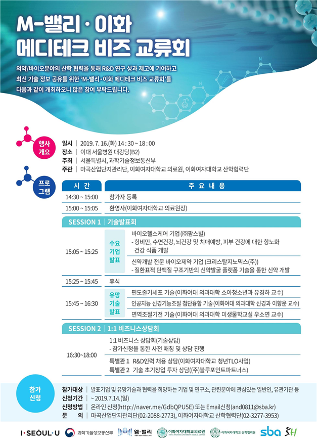 참가 대상은 의약·바이오 관련 마곡산업단지 입주기업 및 서울소재 중소기업, 이대 메디테크 연구진, 일반인 누구나 참여 가능하다.