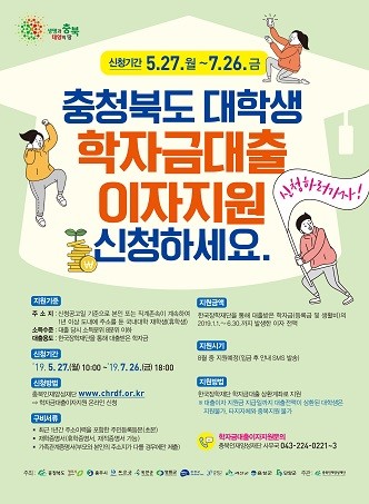 신청은 충북인재양성재단 홈페이지를 통해 오는 26일까지 온라인 신청하면 되며, 구비서류는 최근 1년간 주소이력을 포함한 주민등록 초본과 재학증명서를업로드해야 한다.