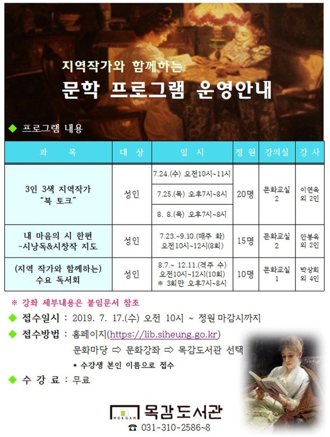 수강신청은 7월 17일 오전 10시부터 중앙도서관 홈페이지 문화마당의 문화강좌 코너에서 목감도서관을 선택해 선착순 접수하면 된다.