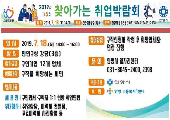 안양시는 오는 18일 목요일만안구청 강당에서 찾아가는 취업박람회를 개최한다.