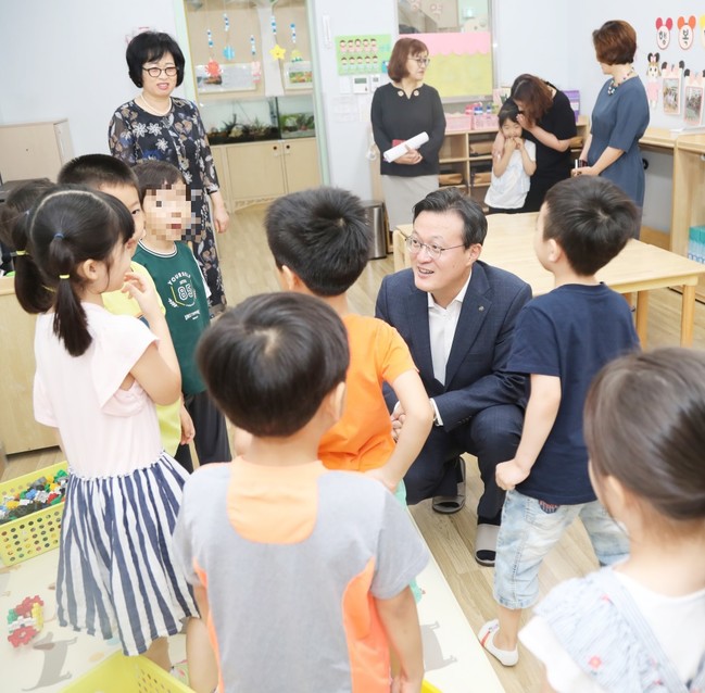 채현일 영등포구청장이 지난 11일 ‘민생 현장 공감 투어’를 위해 국공립 동화어린이집에 방문해 원아들과 함께 이야기를 나누고 있다.