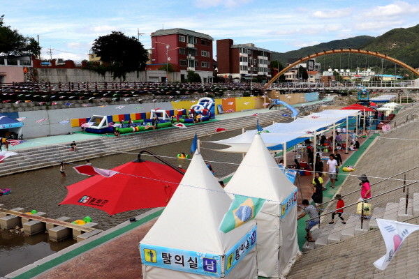 용화천 물놀이장은 용화천 인도교 아래 7,000㎡ 규모의 하천과 수변길을 활용해 워터슬라이드 및 에어풀장, 수중축구장을 비롯해 종합물놀이시설과 페달보트를 무료로 이용할 수 있어 아이들이 함박웃음을 짓고 있다.