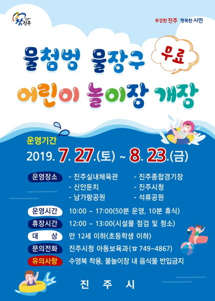 진주시가 여름방학을 맞아 오는 27일부터 8월 23일까지 어린이와 어린이를 동반한 시민들을 대상으로 도심 속 어린이 물놀이장을 무료로 운영한다.