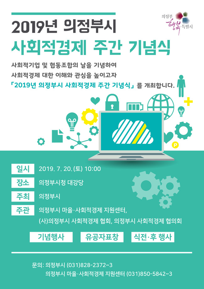 사회적경제 주간 기념식에 참여를 원하는 시민은 의정부시청 대강당으로 9시 30분까지 참석하면 되고, 기타 자세한 사항은 의정부시 마을·사회적경제 지원센터(031-850-5843)로 문의 하면 된다.