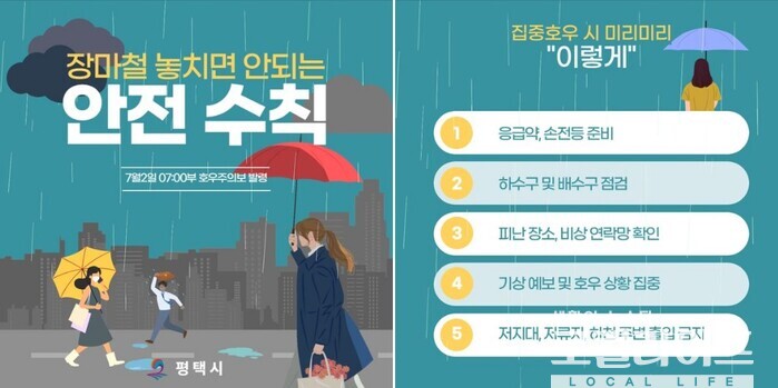 이어 “평택시는 재난안전대책본부가 중심이 되어 재난 상황 및 호우 피해 예방에 최선을 다하겠다”며 “시민 여러분께서도 하천 주변 및 저지대, 붕괴 우려지역 접근을 자제해 주시고, 지하실이나 하수구 등의