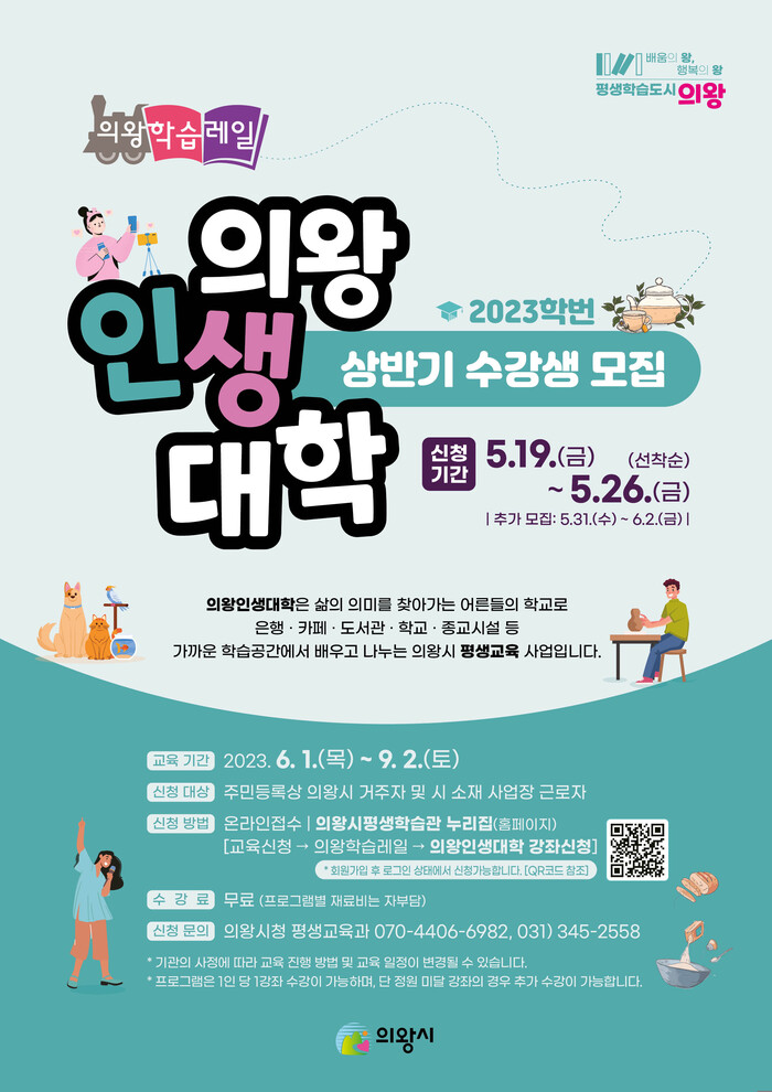 의왕인생대학 강좌와 관련한 자세한 사항은 교육 운영업체(070-4406-6982) 또는 의왕시청 평생교육과(031-345-2558)로 문의하면 된다.