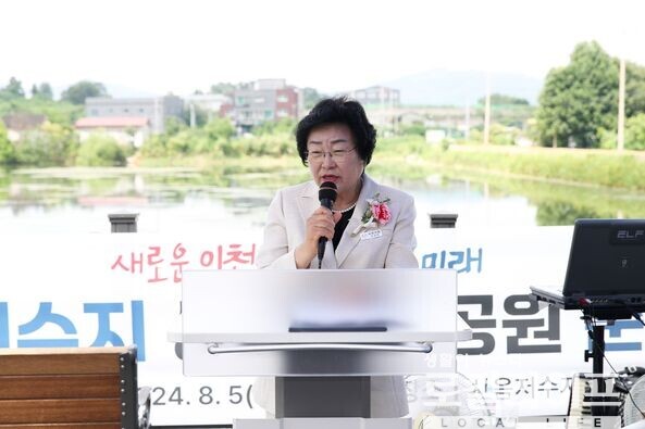 | ▲ 김경희 이천시장이 ‘생태환경 공원 준공식’에서 축사를 하고 있다. (사진출처=김경희 페이스북) |