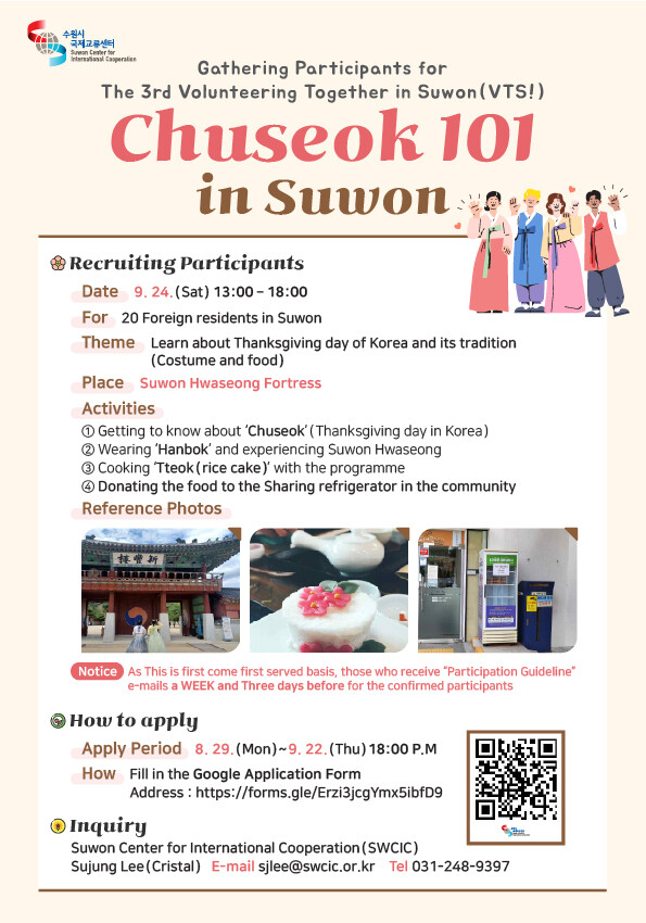 구글 링크(https://forms.gle/m6jE1mF8cssDFtTz6)나 모집 포스터에 수록된 QR코드를 스캔해 신청할 수 있다. 수원시국제교류센터 홈페이지(https://www.swcic.or.kr/) ‘센터소식→공지사항’에서 신청해도 된다.