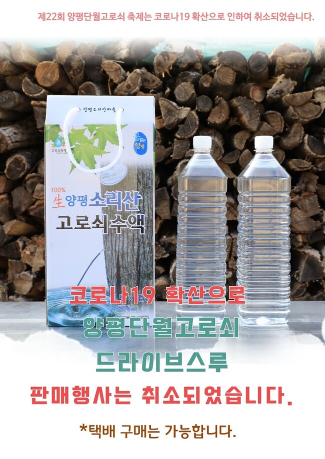 여용수 양평단월고로쇠축제추진위원장은 “소비부진으로 어려움을 겪고 있는 농가를 위해 행사를 개최하려 했으나 주민의 안전과 건강을 위해 피치못하게 취소를 결정했다”며, “행사를 위해 준비한 고로쇠물은 택배 주문으로 판매할 예정으로 행사 취소로 인한 피해를 최소화하기 위해 최선을 다하겠다”고 전했다.