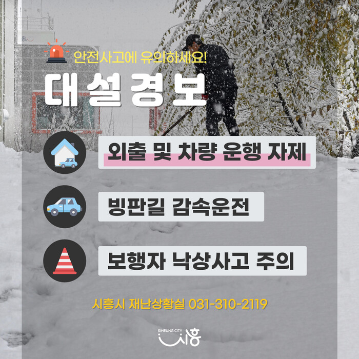 이와 관련해 시흥시는 공식페이스북을 통해현재 시흥시 전역에 많은 눈이 내리고 있다.