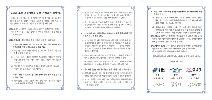 협약은 ▲고기동 주변 도로 등 도시기반 시설 확충 ▲민자도로 사업계획과 연계한 교통난 해소 대책 ▲고기교 주변 도로 교통영향분석 연구용역 추진 ▲고기교 확장 건설 협력 ▲용인시 중로 3-177호선 조기 건설 추진 등의 내용을 담았다.