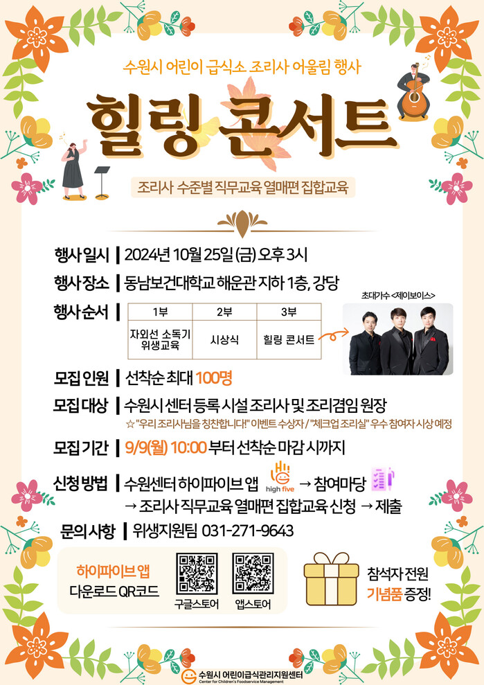 수원시어린이급식관리지원센터가 10월 25일 오후 3시 동남보건대학교 해운관 강당에서 어린이 급식소 조리사 어울림 행사인 ‘힐링콘서트’를 연다.