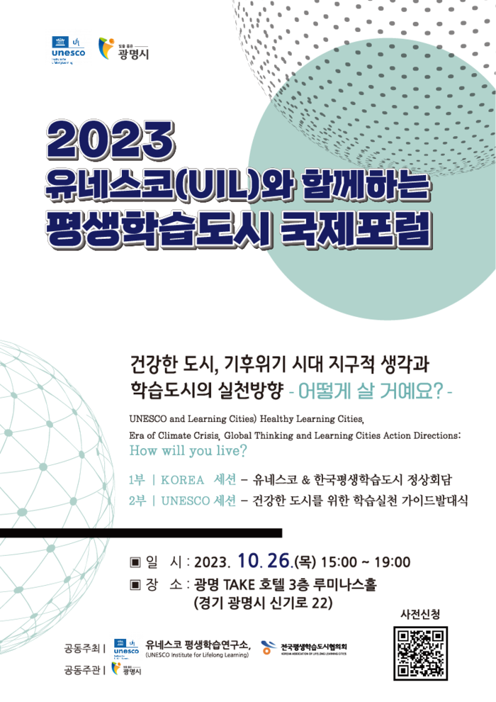 전국평생학습도시협의회(회장:박승원 광명시장, 이하 전도협)는 26일 오후 광명 테이크 호텔 3층 루미나스홀에서 ‘2023 유네스코(UIL)와 함께하는 평생학습도시 국제포럼’을 개최한다.