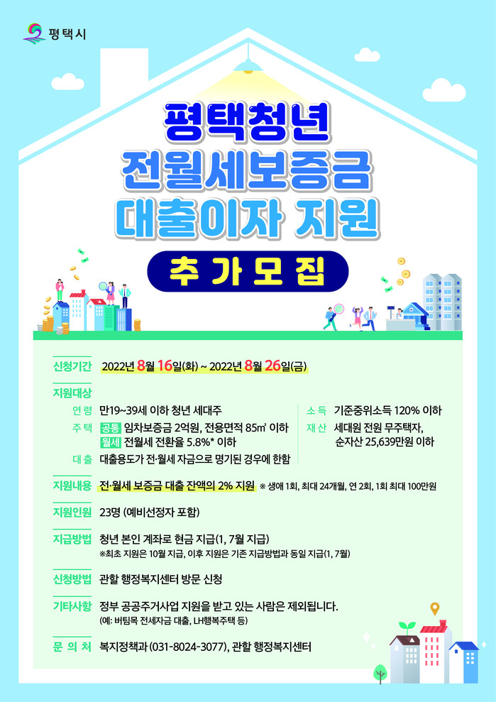 평택시(시장 정장선)는 청년의 주거 안정 및 지역 정착을 돕기 위한 지원정책으로 「평택시 청년 전.월세보증금 대출이자 지원」사업의 추가모집을 오는 8월 16일부터 26일까지 약 2주간 거주지 관할 행정복지센터에서 신청을 받을 예정이라고 밝혔다.