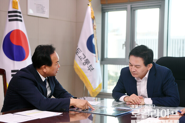 | ▲ 이권재 오산시장(왼쪽)이 원희룡 국토부 장관(오른쪽)에게 오산지역 교통현안에 대해 설명하고 있다. (사진출처=이권재 페이스북) |