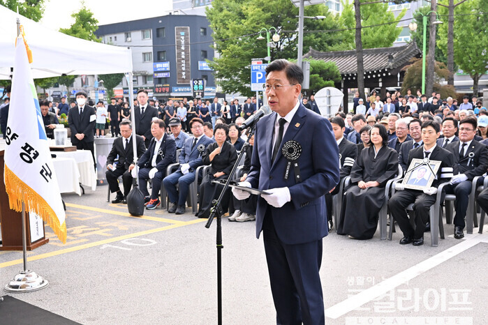 | ▲ 전진선 양평군수가 고 정동균 전 양평군수 영결식에서 추도사를 하고 있다. (사진출처=전진선 페이스북) |