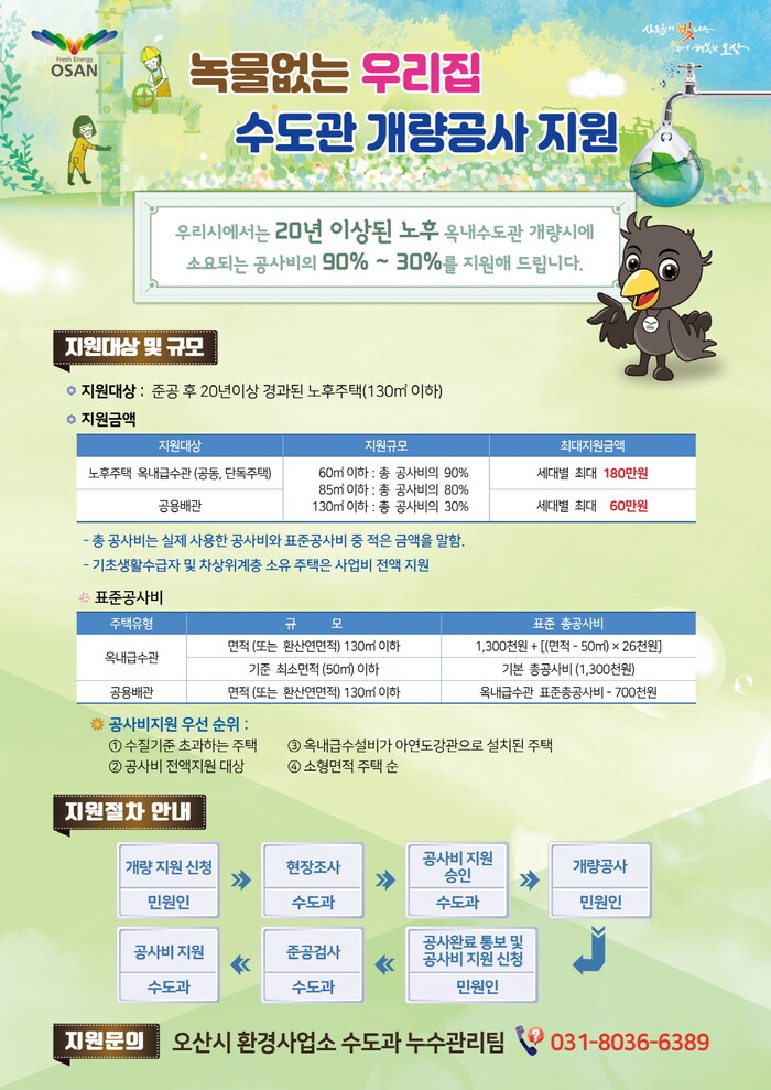 오산시(곽상욱 시장)는 올 한해 1억 5천만원의 예산을 지원해 수도관이 노후되어 수돗물 사용에 불편을 겪는 주택의 수도관 개량 공사 지원사업을 시행한다고 17일 밝혔다.