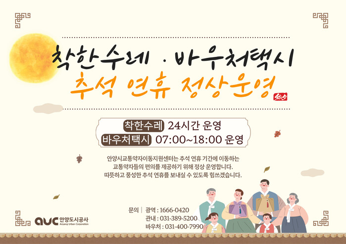 추석 연휴에도 안양 착한수레는 교통약자 이동편의를 위해 기존과 변함없이 정상운영 된다. 기존 추석 당일과 일요일 사전예약제로 운영되던 시스템에서 언제든 24시간 즉시콜로 더욱 간편하게 이용 가능하다. 바우처택시는 공휴일 운영기준(07-18시)에 맞춰 정상 운영되고 일요일은 운영하지 않는다.