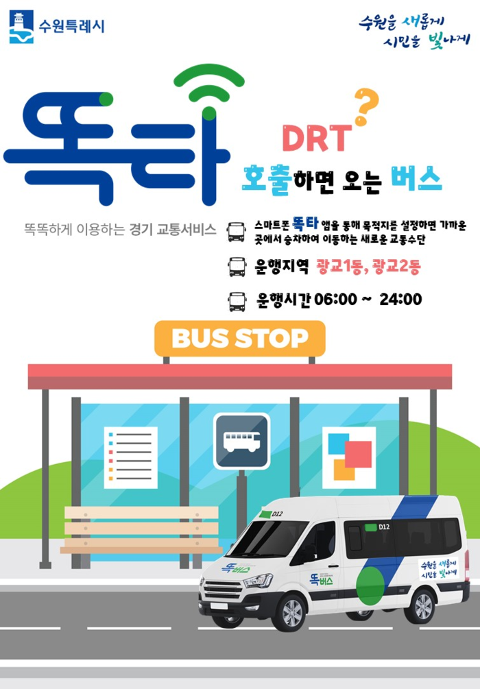 수원시 관계자는 “대중교통수단이 상대적으로 열악한 광교1·2동에 똑버스가 운행돼 시민들이 한결 편리하게 이동할 수 있을 것”이라며 “스마트폰 이용에 어려움을 겪는 어르신들을 위해 광교 지역 수원시 디지털배움터에서 똑타 앱 설치·이용 방법을 교육해 어르신들이 똑버스를 이용하실 수 있도록 지원하겠다”고 말했다.