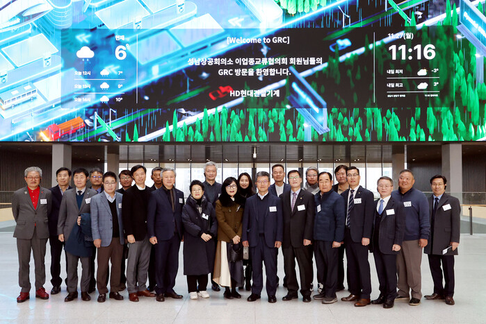 성남시의회(의장 박광순)와 성남상공회의소(회장 정영배)는 지난 11월 27일 성남시 분당구에 위치한 HD현대그룹 사옥 ‘글로벌 R&D센터(GRC)’에서 HD현대건설기계(주) 임원진과 함께 「이업종교류협의회」11월 정례회의를 개최하였다.