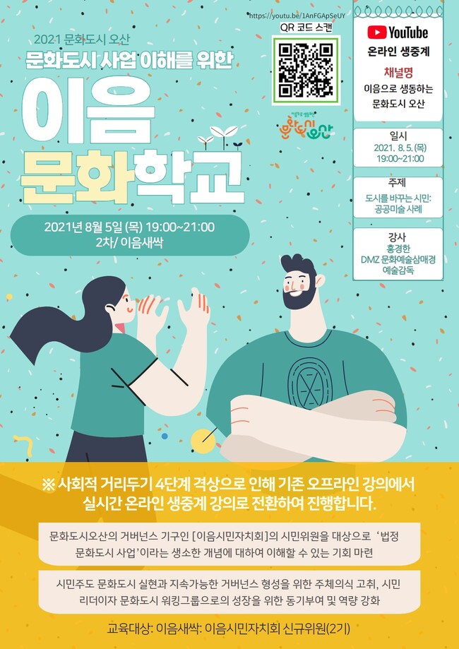‘이음시민자치회’의 신규 이음시민위원과 문화도시 오산에 관심 있는 시민을 대상으로 문화도시 시민 역량 및 거버넌스 강화를 위해 준비된 [이음문화학교 - 이음새싹] 두 번째 강의는 오는 5일 목요일 19시에 문화도시 오산 공식 유튜브 채널 <이음으로 생동하는 문화도시 오산>을 통해 실시간 스트리밍 강의로 진행한다.
