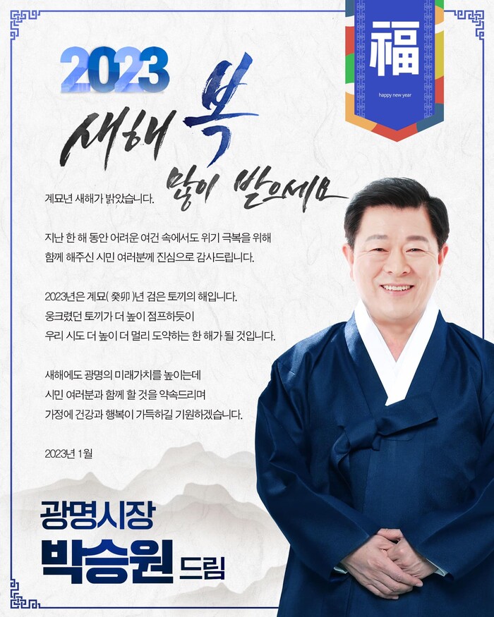 [로컬라이프] 송준형 기자 = 박승원 광명시장은 1일, 자신의 페이스북을 통해 계묘년 새해가 밝았다. 새해 복 많이 받으세요라며, 지난 한 해 동안 어려운 여건 속에서도 위기 극복을 위해 함께 해주신 시민 여러분께 진심으로 감사드린다고 말했다.