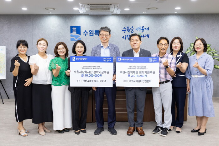 정승연 수원시장학재단 이사와 수원시어린이집연합회가 수원시장학재단에 장학금을 기탁했다. 정승연 이사가 1000만 원, 수원시어린이집연합회는 연합회 소속 어린이집 원아들이 모은 391만 원을 기부했다.