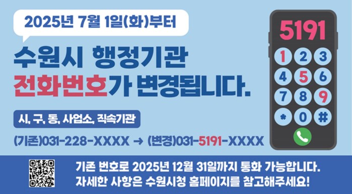 [수원=로컬라이프] 조준영 기자 = 수원특례시는 7월 1일부터, 모든 행정 전화번호 앞자리가 '5191'로 통일된다. 오직 수원시만 쓰는 번호라고 밝혔다.